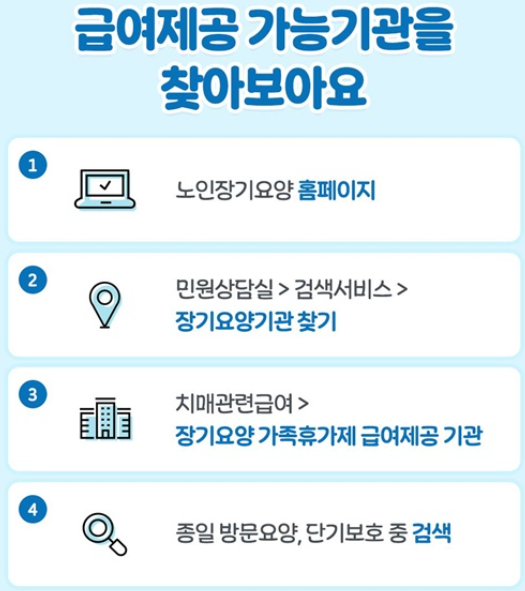 급여를 제공하는 기관은 노인장기요양 홈페이지에서 쉽게 찾아볼 수 있어요. 홈페이지에서 아래 경로를 따라 확인해보세요!